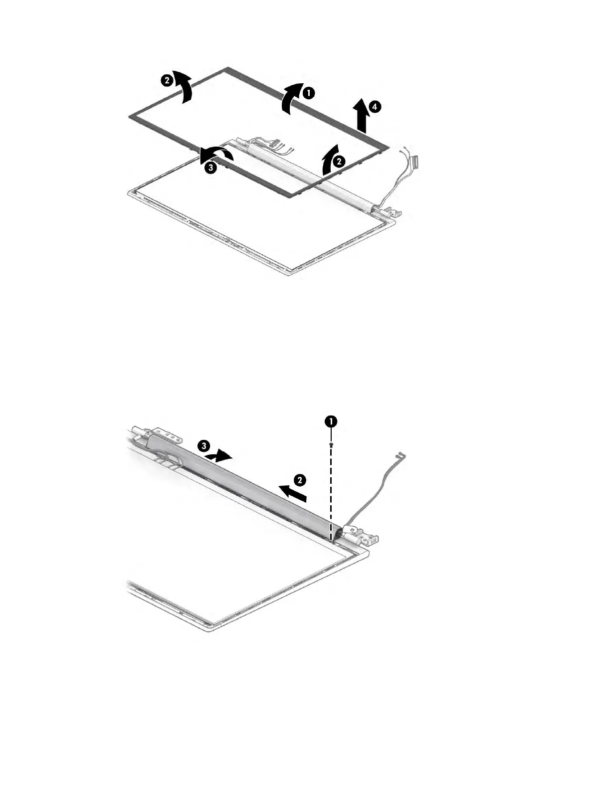 b. Slide the hinge cover (2), rotate the bottom of the cover up, and then remove it from the display