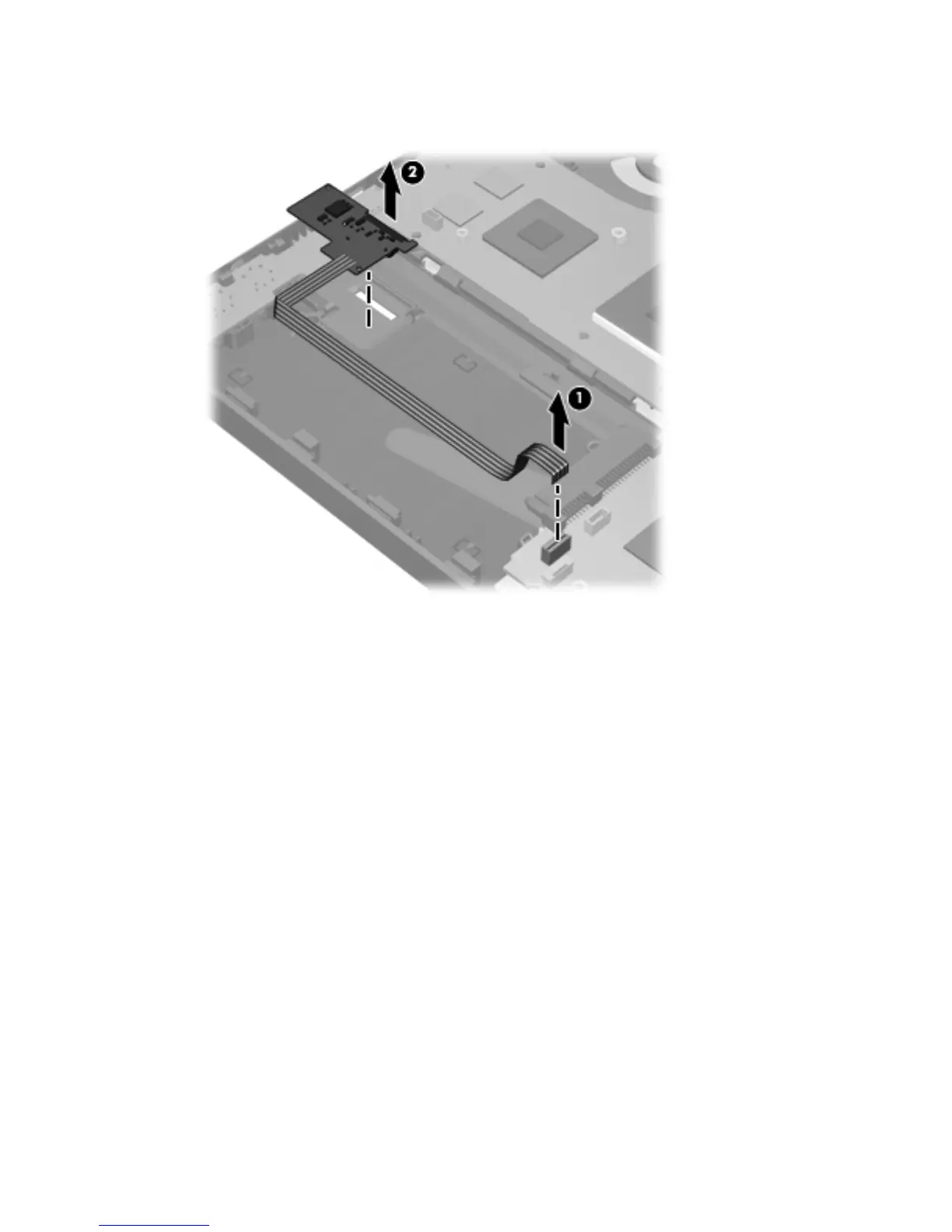 2. Disconnect the cable from the system board (1), and then lift the board straight up and off the