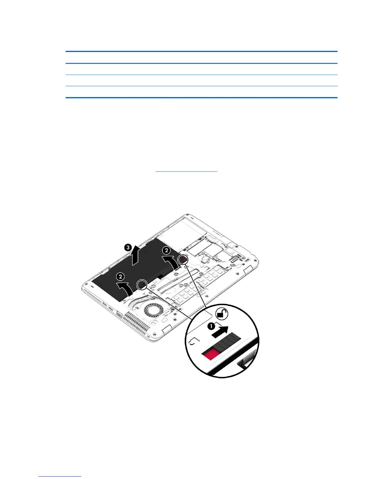 1. Slide the battery release latches (1), and then lift the battery (2).