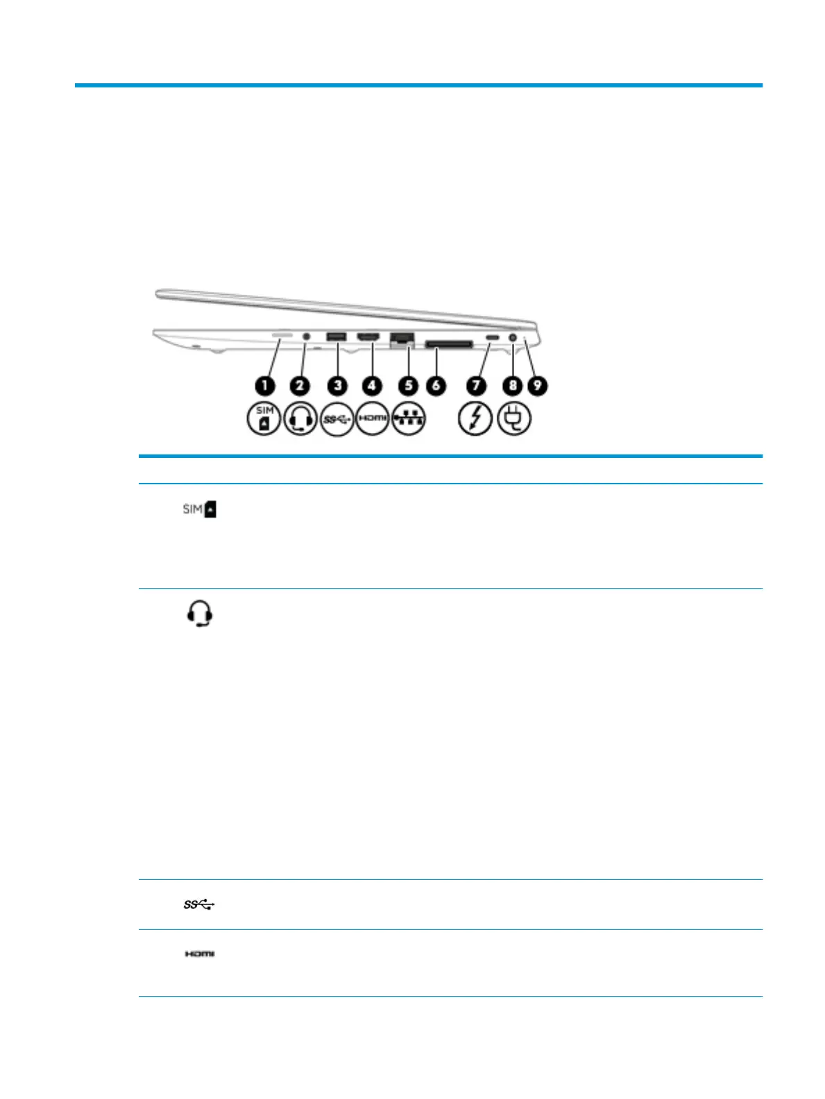 (1) SIM card slot or plug Supports a wireless subscriber identity module (SIM) card or