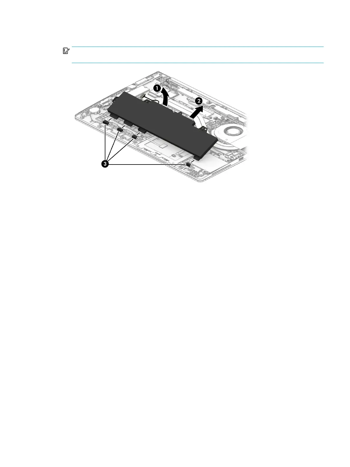 3. Rotate the top of the battery upward (1), and then lift the battery out of the computer (2).