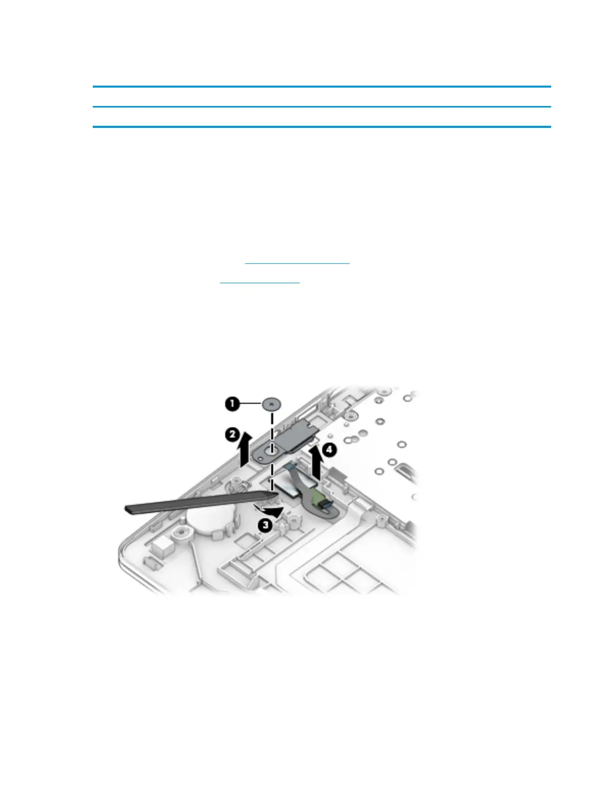 1. Remove the Phillips M2.0×3.0 screw (1) that secures the ngerprint reader bracket to the computer.