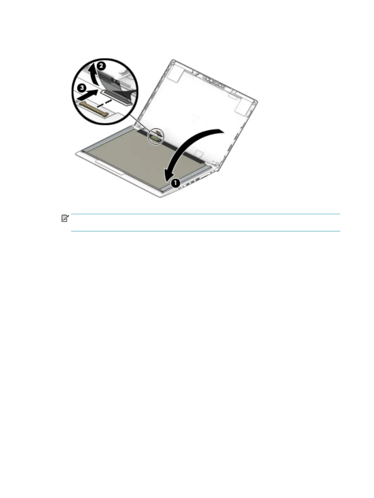 15. On the back of the display panel, lift the tape from atop the connector (2), and then disconnect the