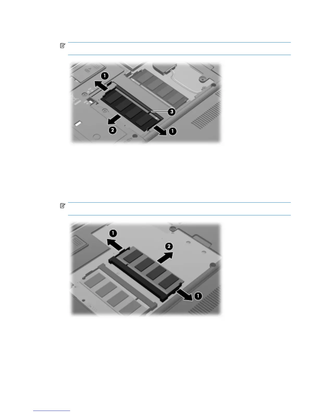 2. Remove the primary memory module (2) by pulling the module away from the slot at an angle.