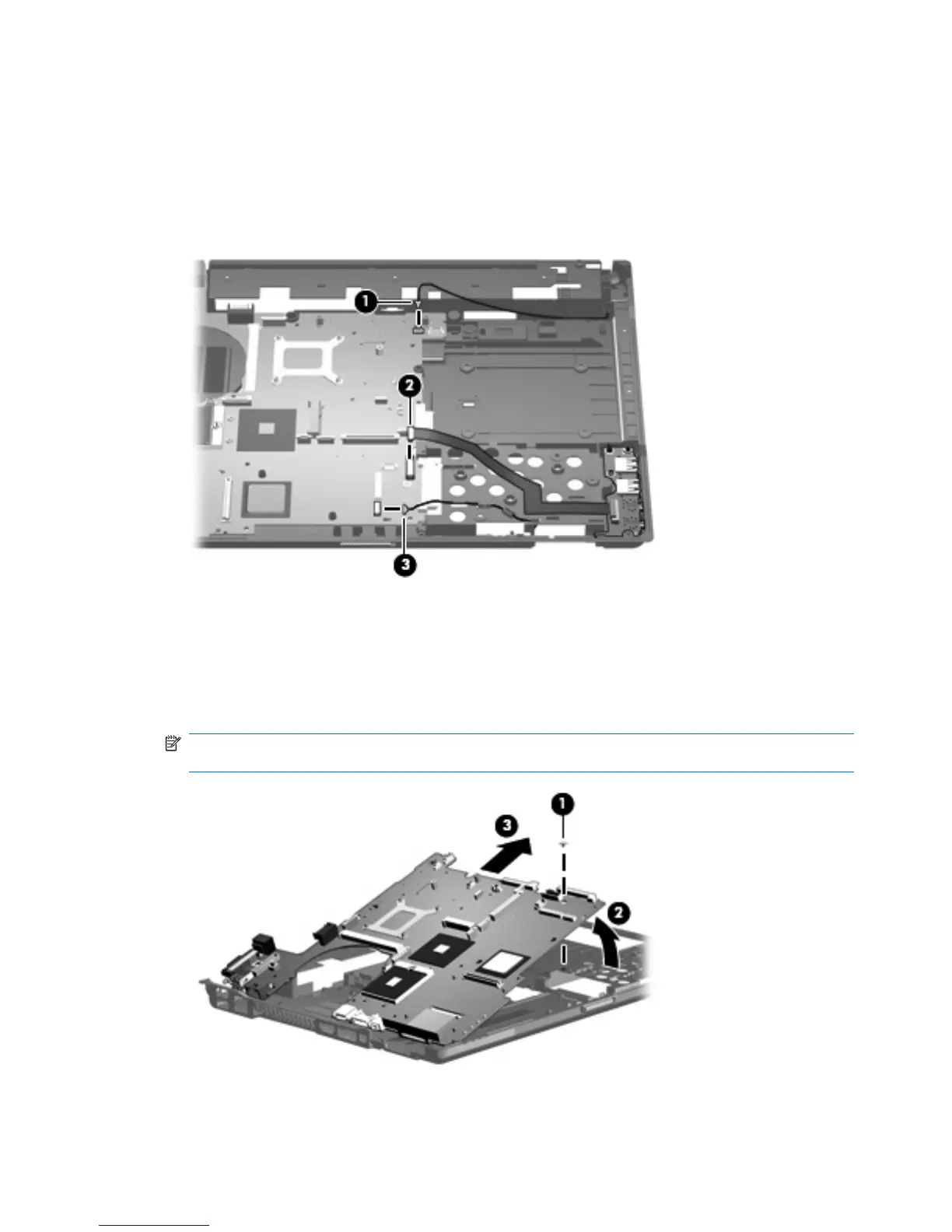 NOTE: When removing the system board and frame, be sure that the USB/audio board cables