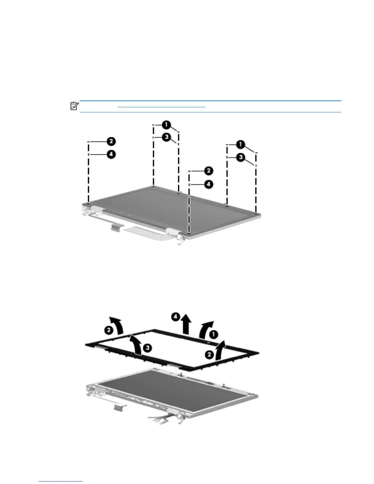 13. Remove the display bezel (4). The display bezel is available using spare part numbers