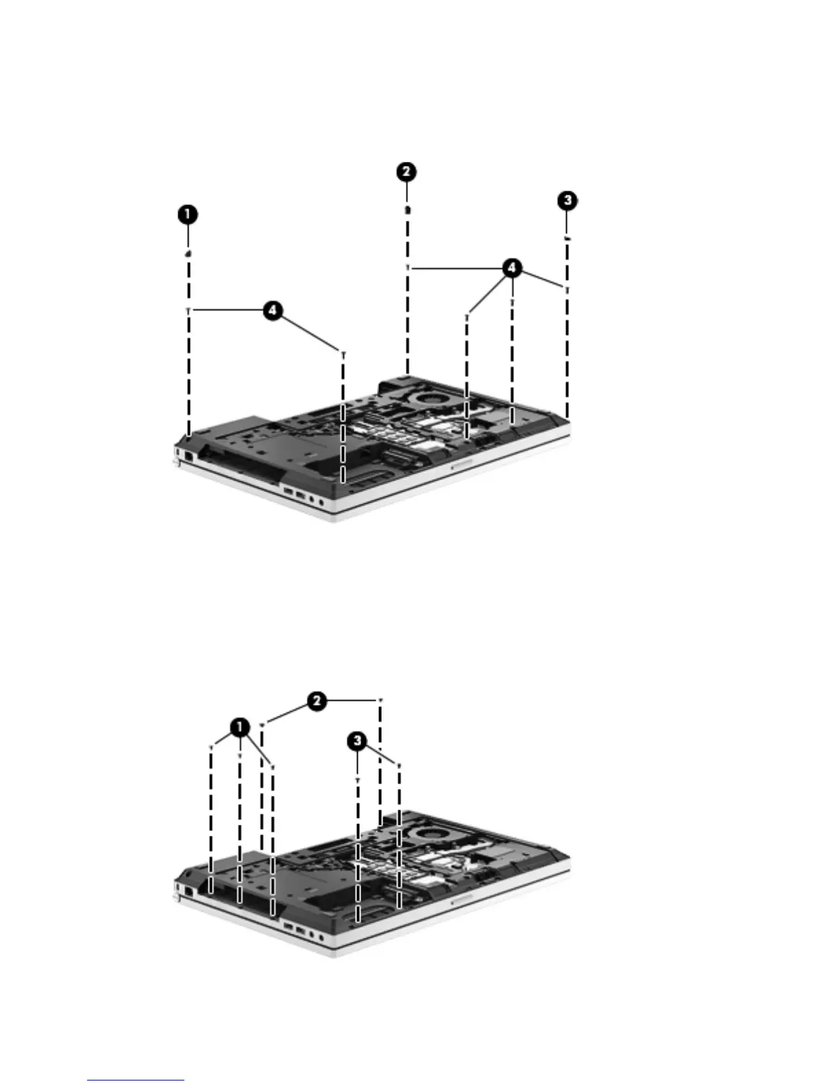 4. Remove the six Torx PM2.5×6.0 screws (4) that secure the base enclosure to the computer.