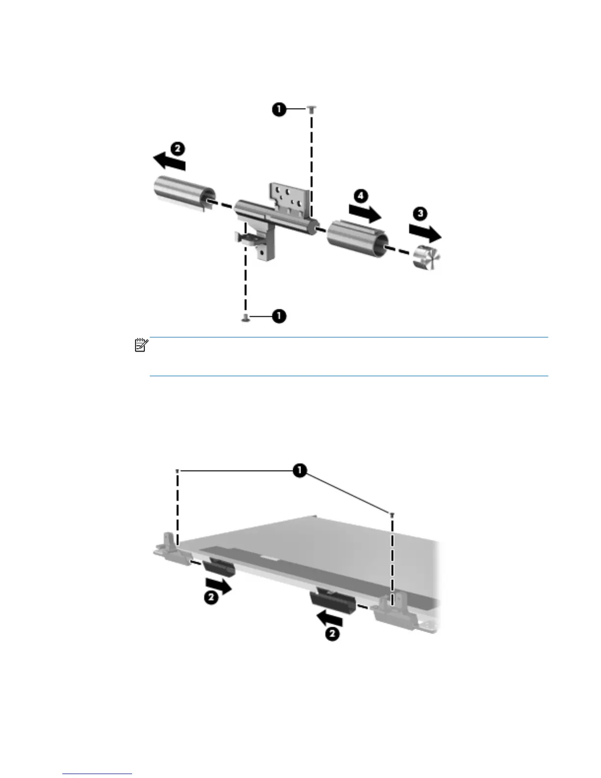 g. Slide the display hinges toward the inside of the display enclosure (2) to remove them. The