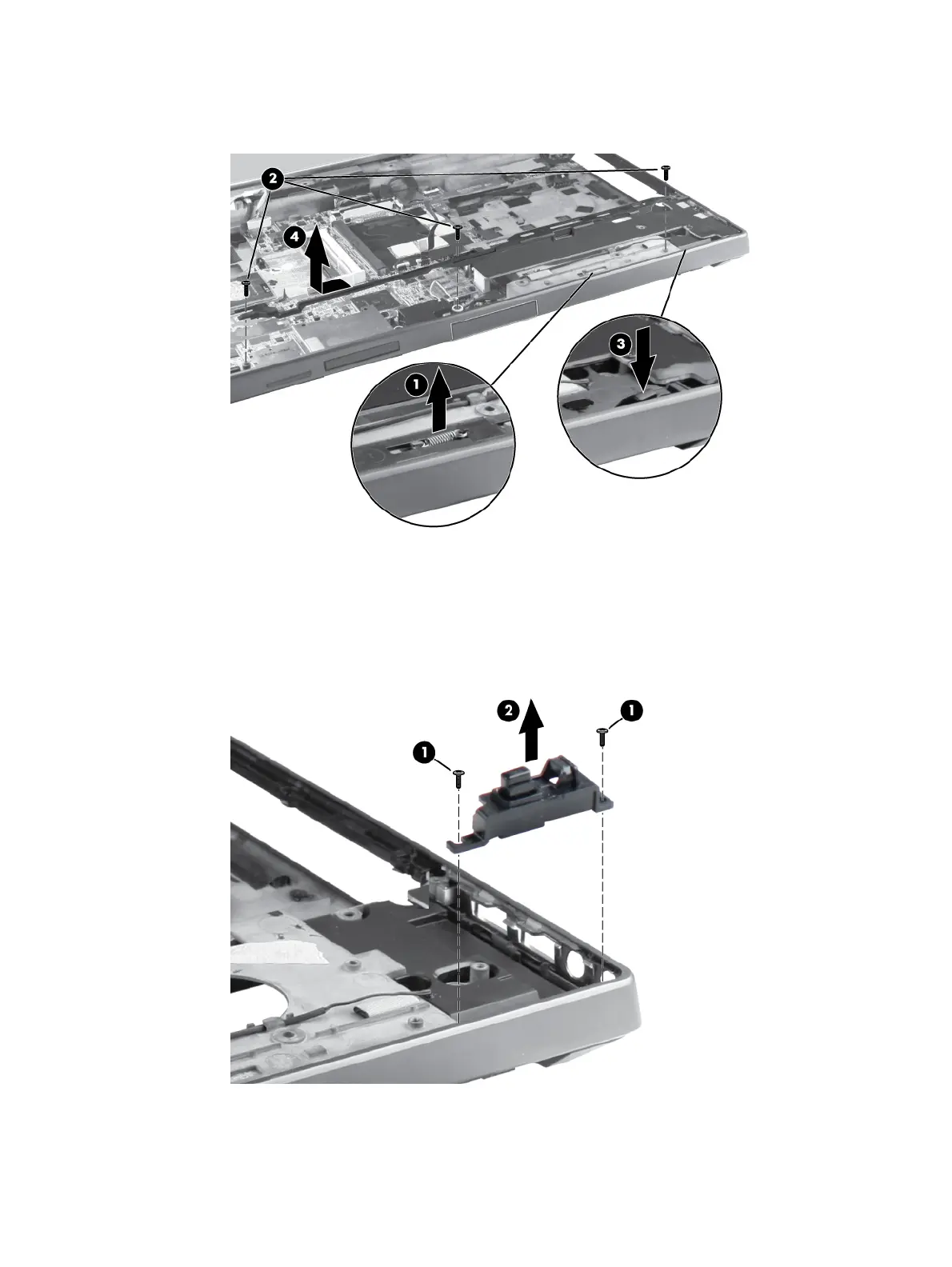 b. Lift the right display latch spring button (2) straight up from the base enclosure.