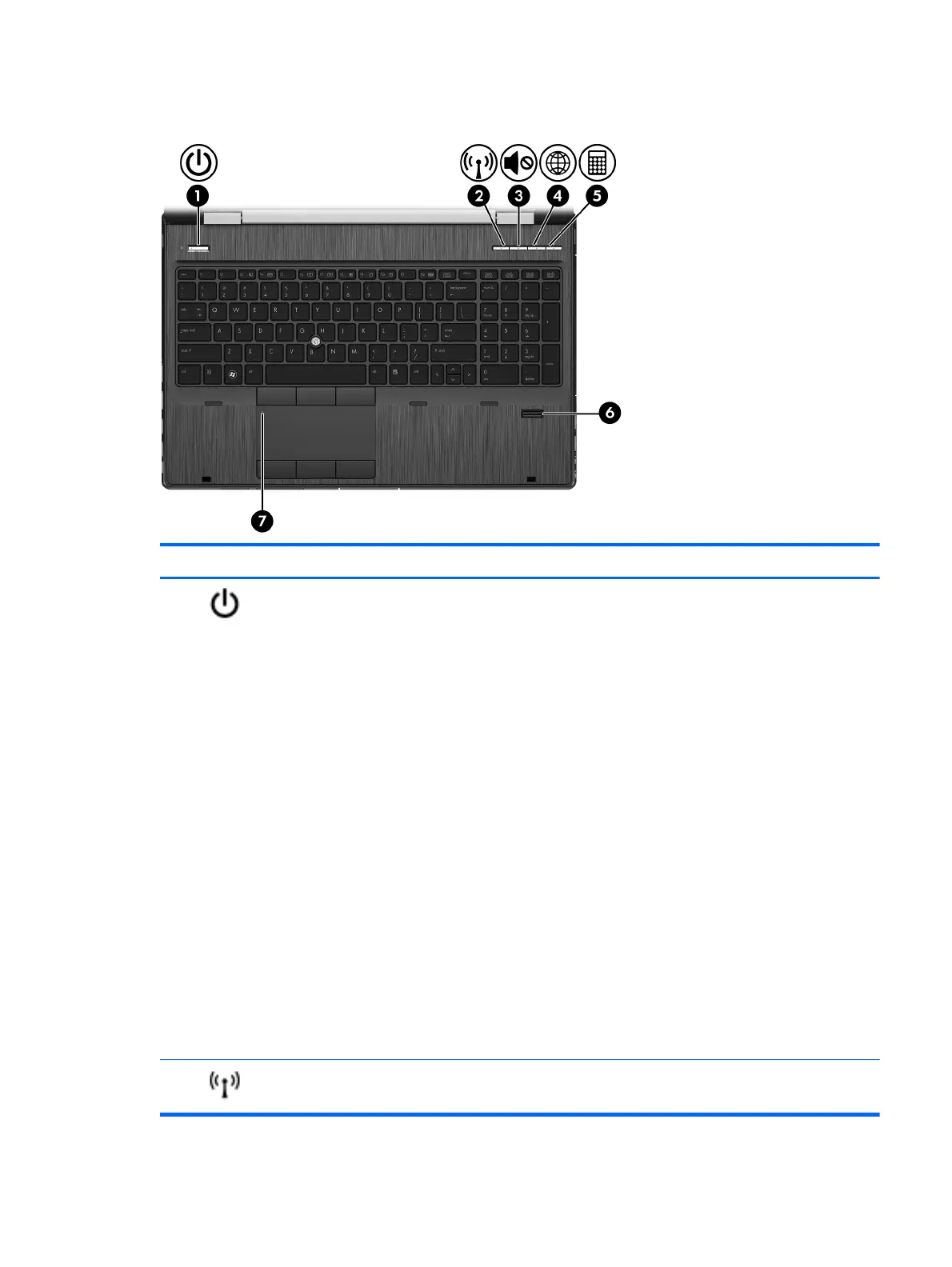 Wireless button Turns the wireless feature on or off but does not establish a