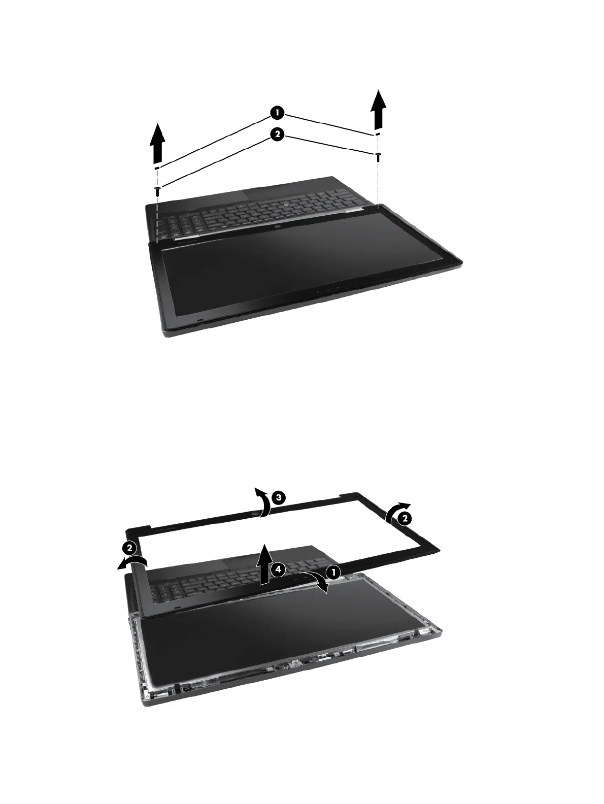 c. Remove the two Torx 8 screws (2) that secure the display bezel to the display enclosure.