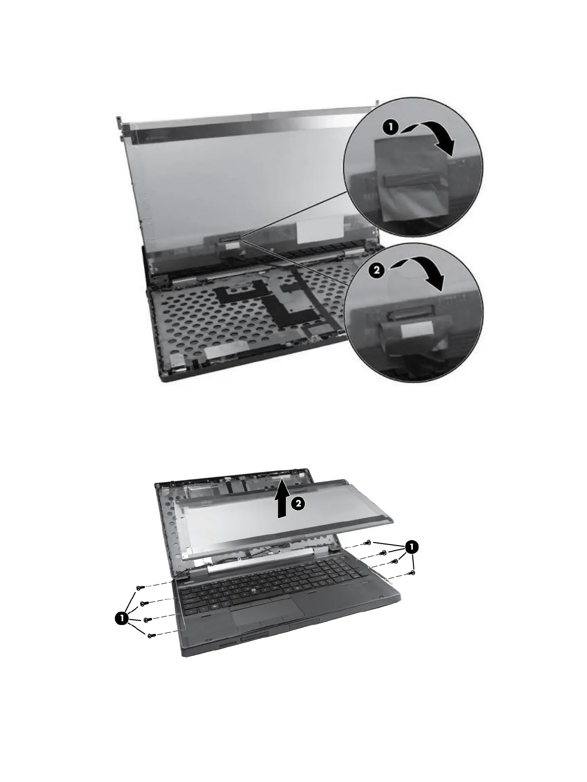 5. Remove the eight Phillips screws (1) that secure the display panel to the display hinges (four on