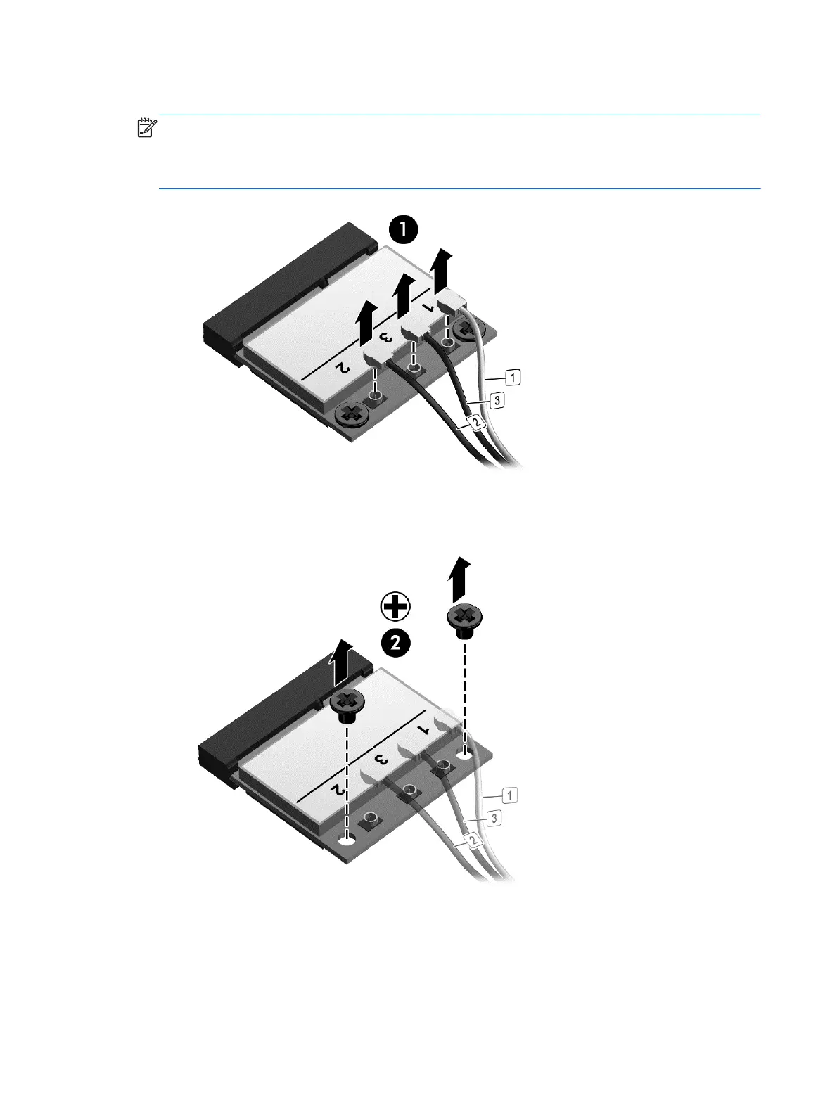 2. Disconnect the WLAN antenna cables (1) from the terminals on the WLAN module.