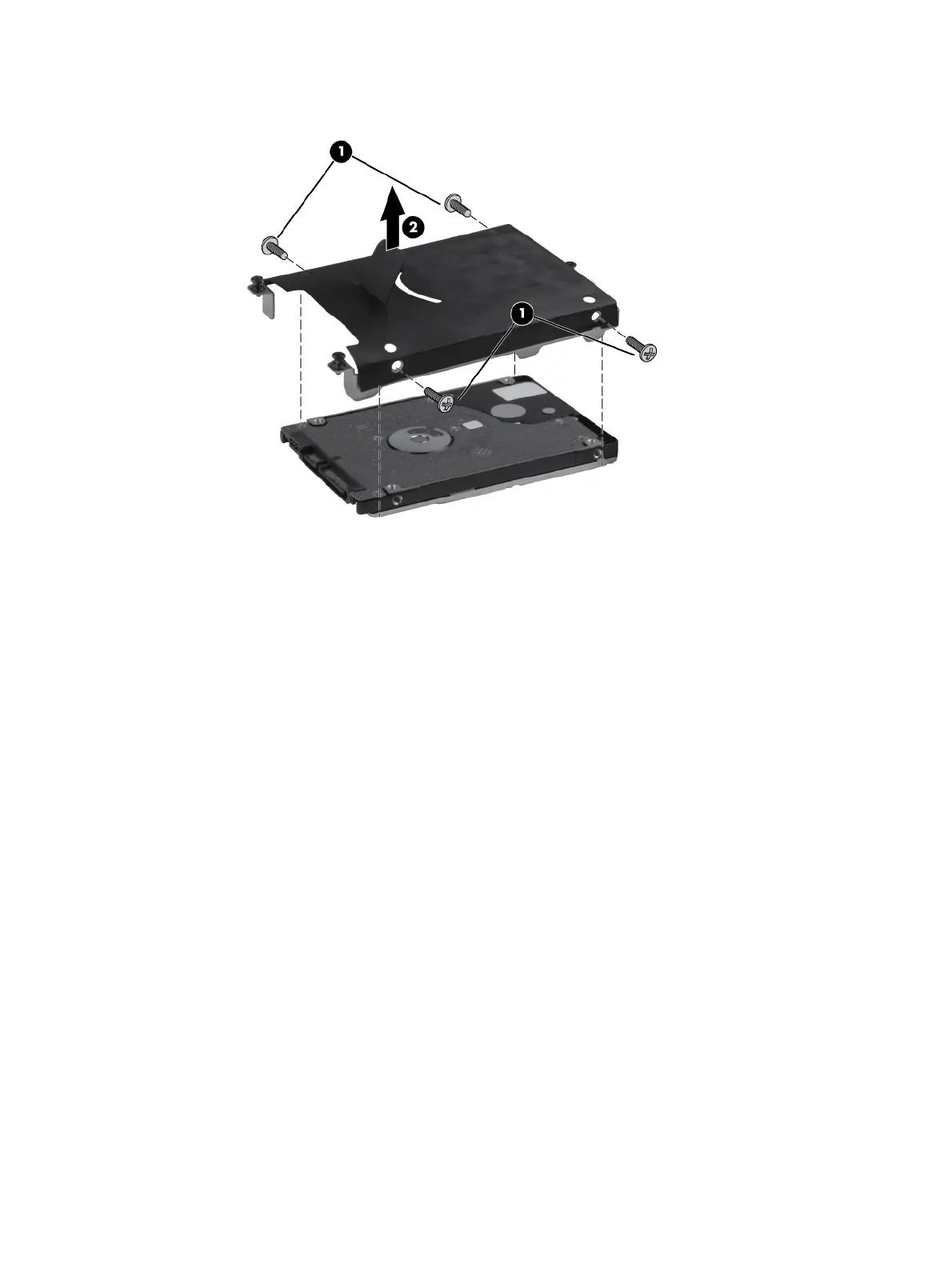 8. Lift the bracket (2) straight up to remove it from the hard drive.