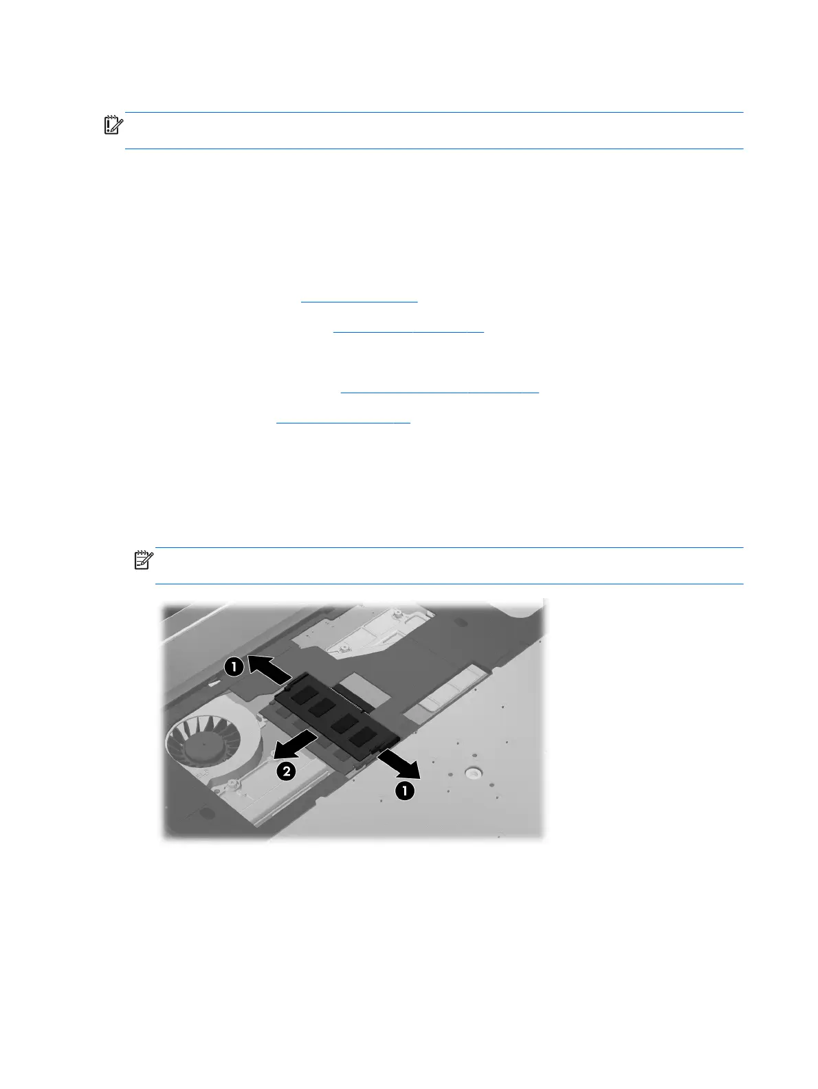 2. Remove the memory module (2) by pulling the module away from the slot at an angle.
