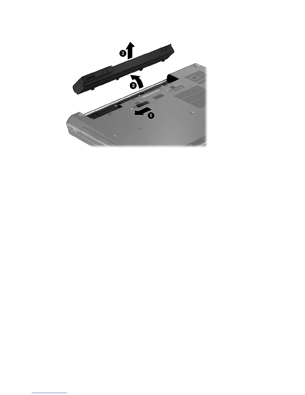 2. Remove the battery from the computer by lifting it away (2) and up (3) from the computer.