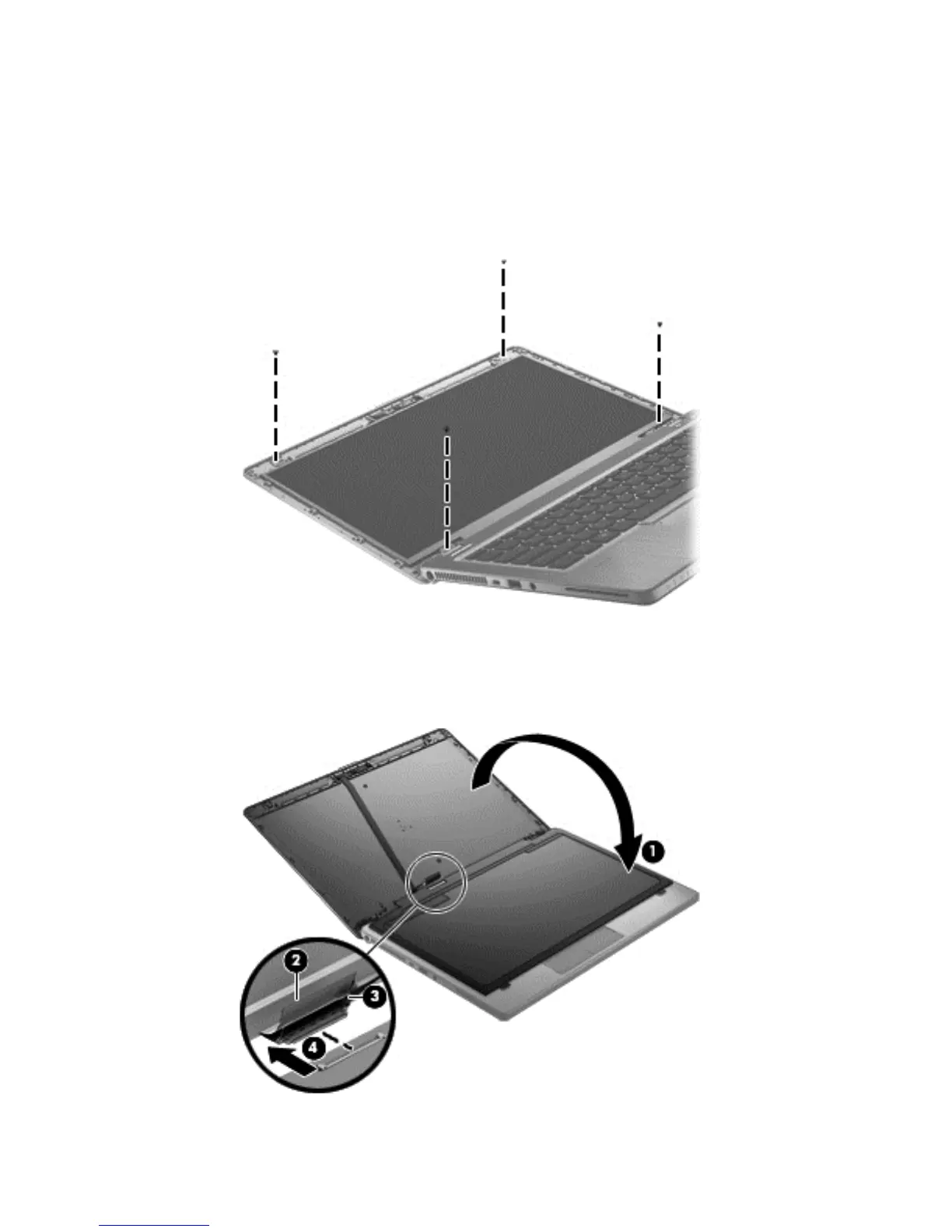 c. Lift the tape that secure the display cable connector on the panel (2), and then disconnect the