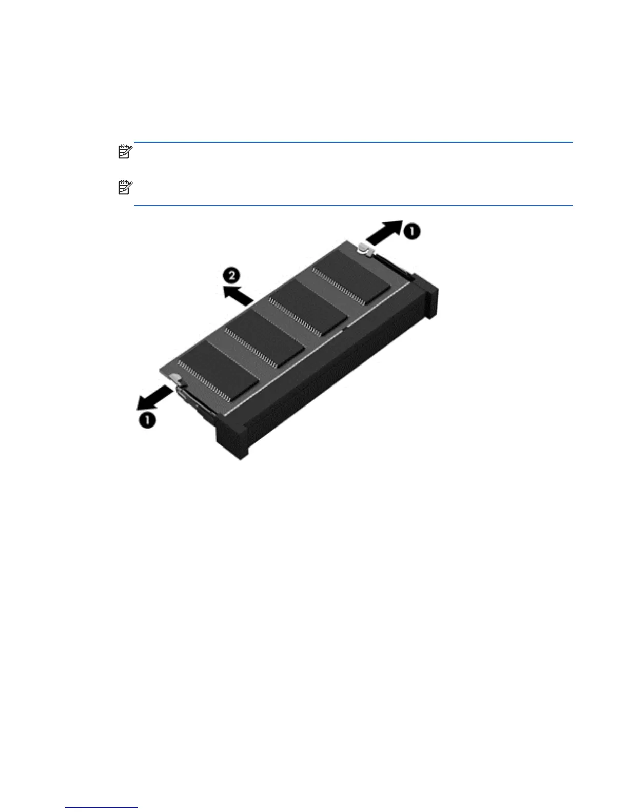 2. Remove the memory module (2) by pulling the module away from the slot at an angle.