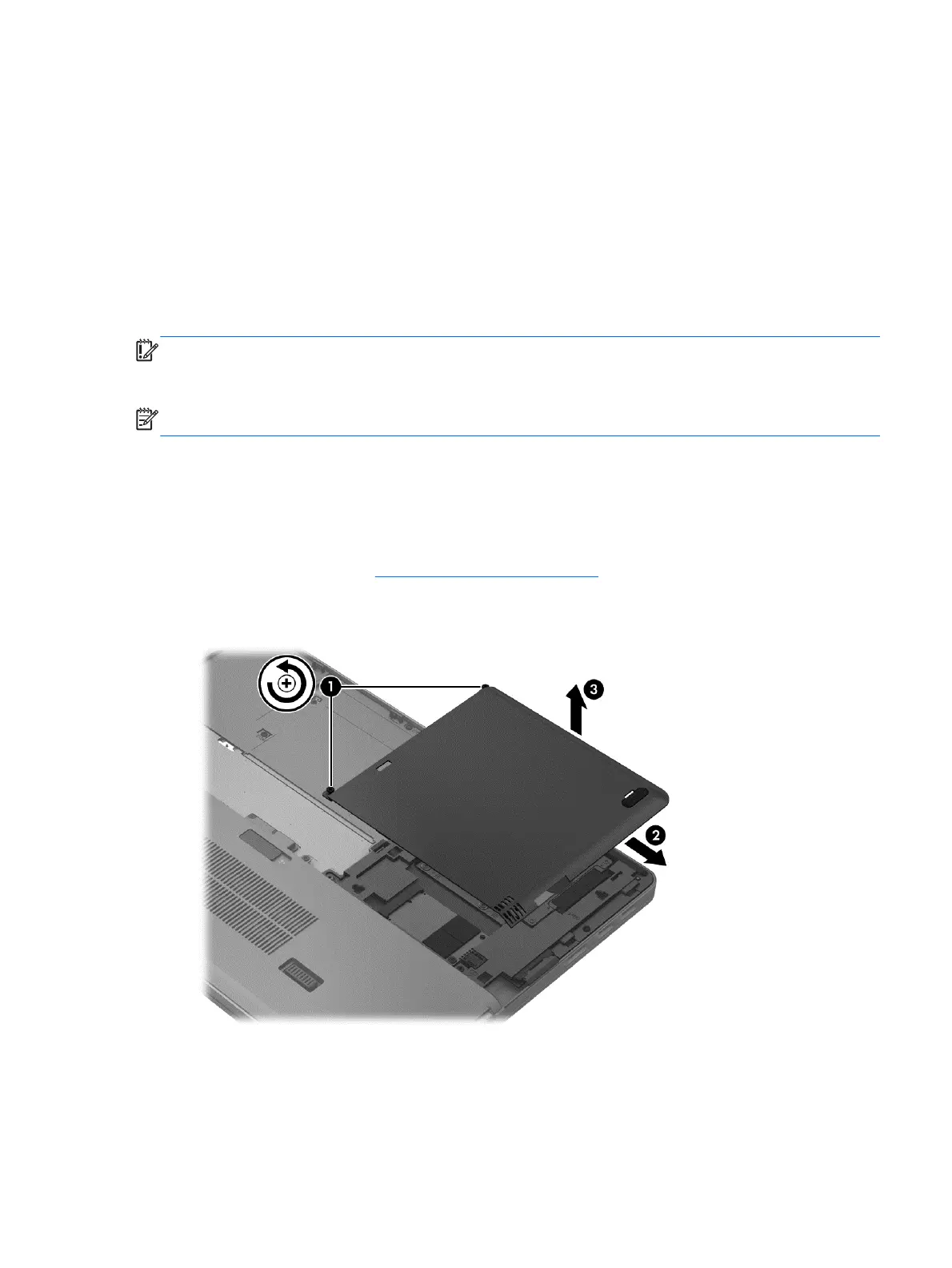2. Loosen the 2 hard drive cover screws (1). Slide the hard drive cover outward (2) from the