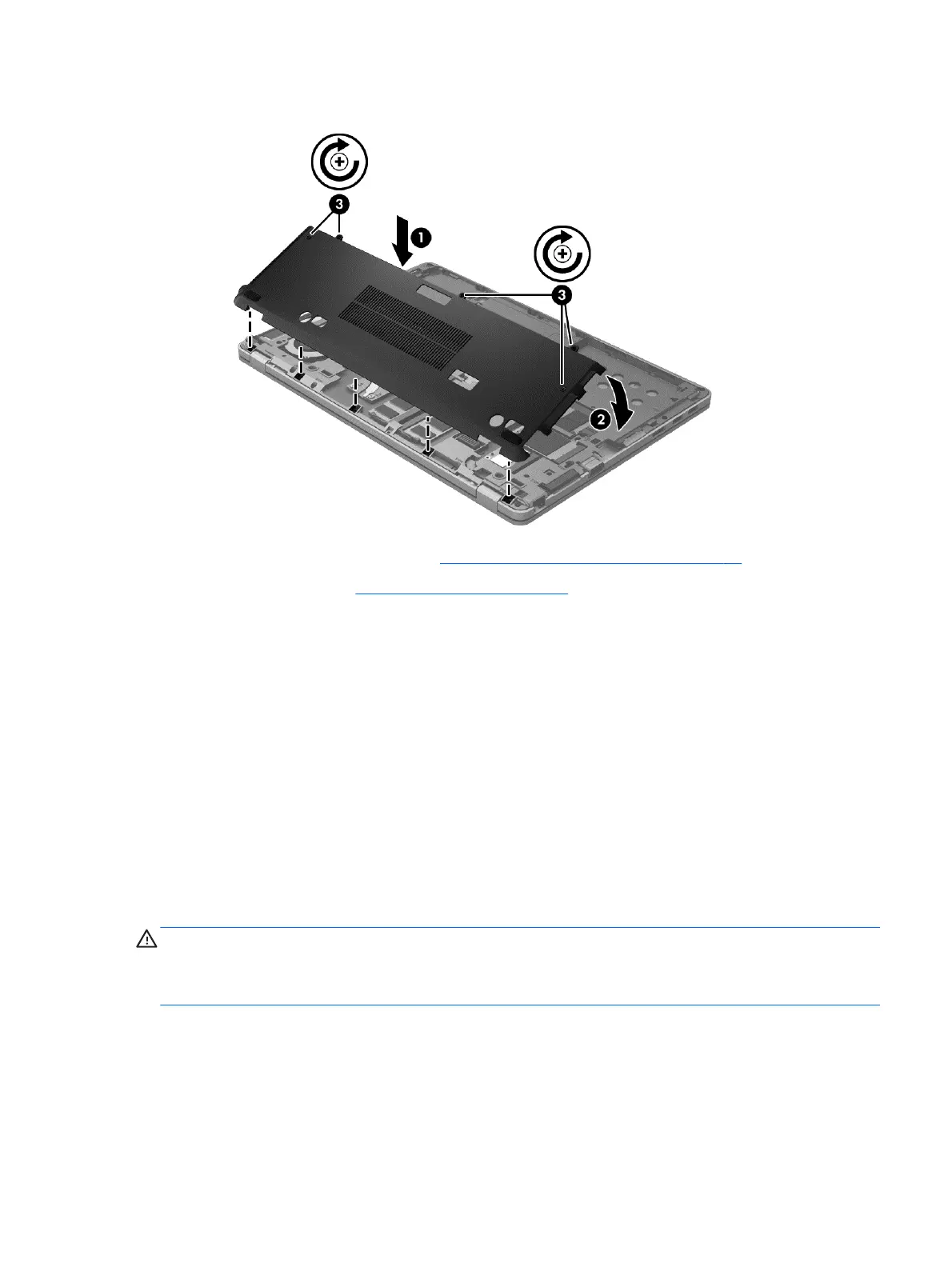 c. Rotate the door down (2), and then tighten the 5 screws (3).