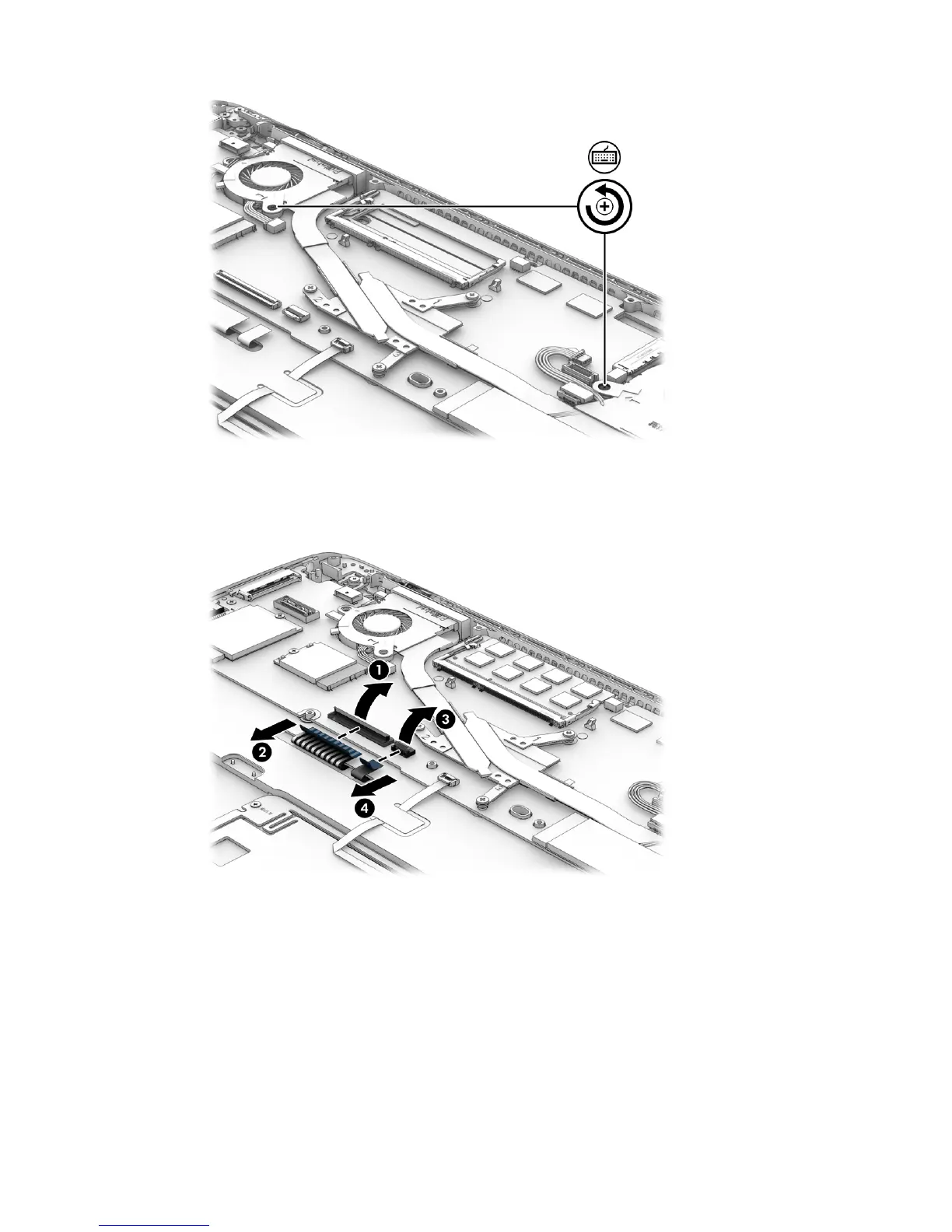 Release the keyboard connector (1) and remove the cable (2).