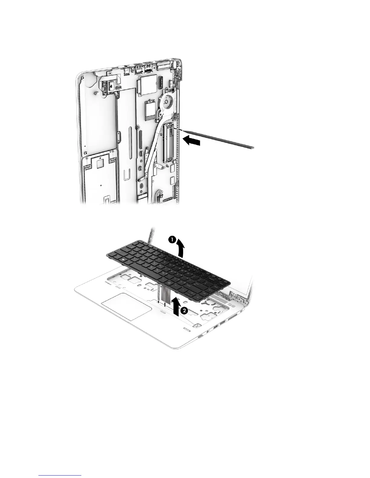 5. Lift the rear edge of the keyboard (1), and then remove the keyboard (2).