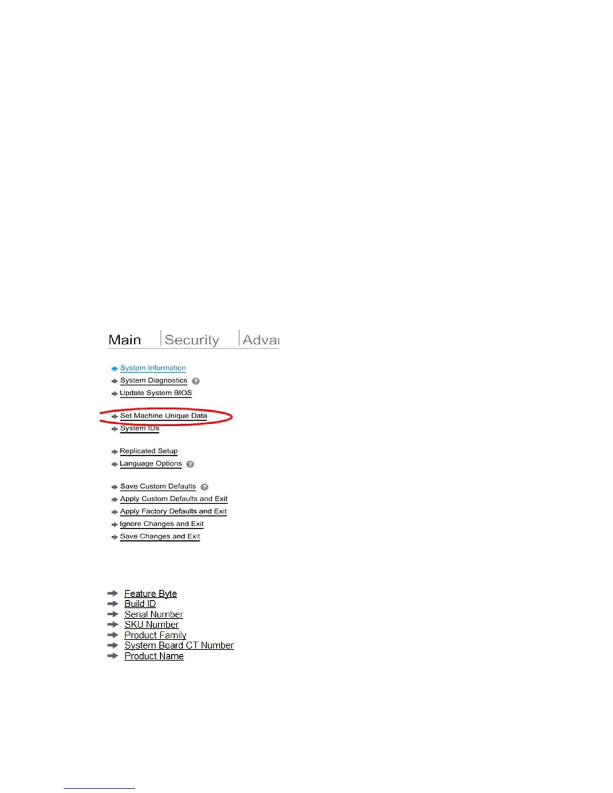 When the notebook is in MPM unlock mode, the Set Machine Unique Data option appears in the Main Menu of