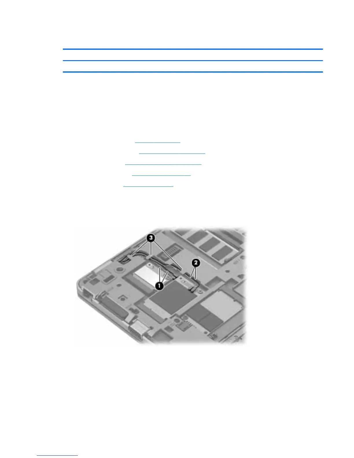 2. Remove the WLAN (1) and WWAN (2) antennas from the routing path (3) in the base enclosure.