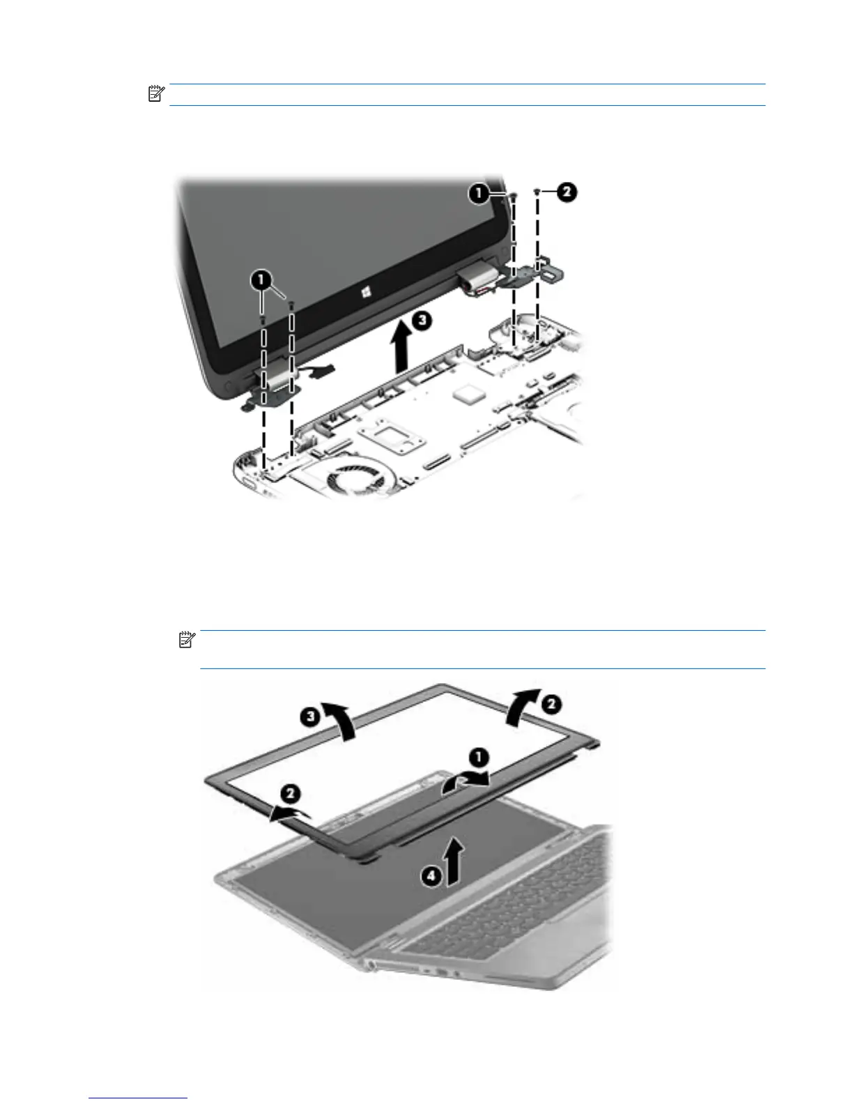 b. Remove the display bezel (4). The display bezel is available using spare part number 769705-001