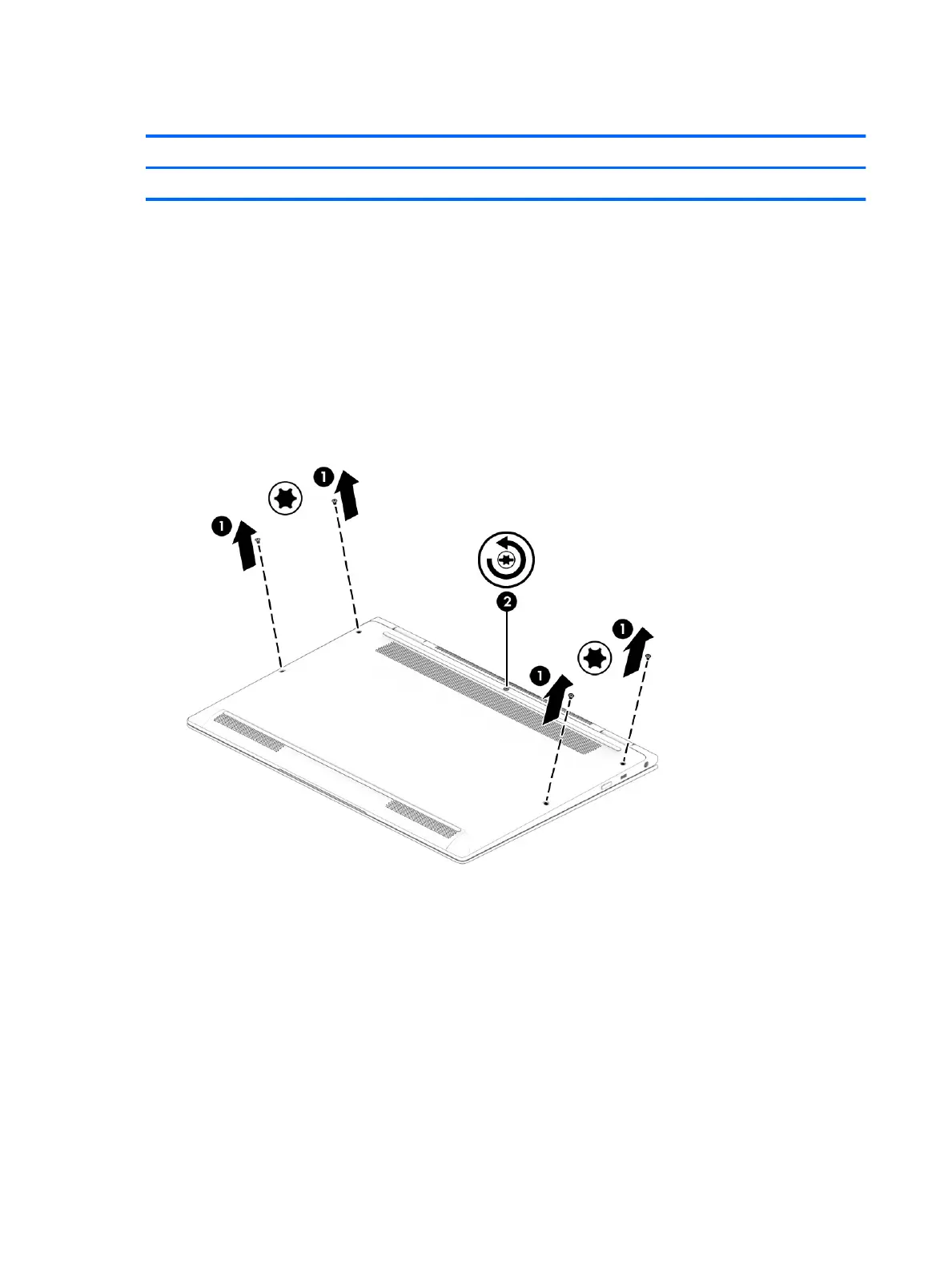 1. Remove the four Torx T8M2.0×4.3 screws (1) and loosen the captive screw (2) that secures the bottom