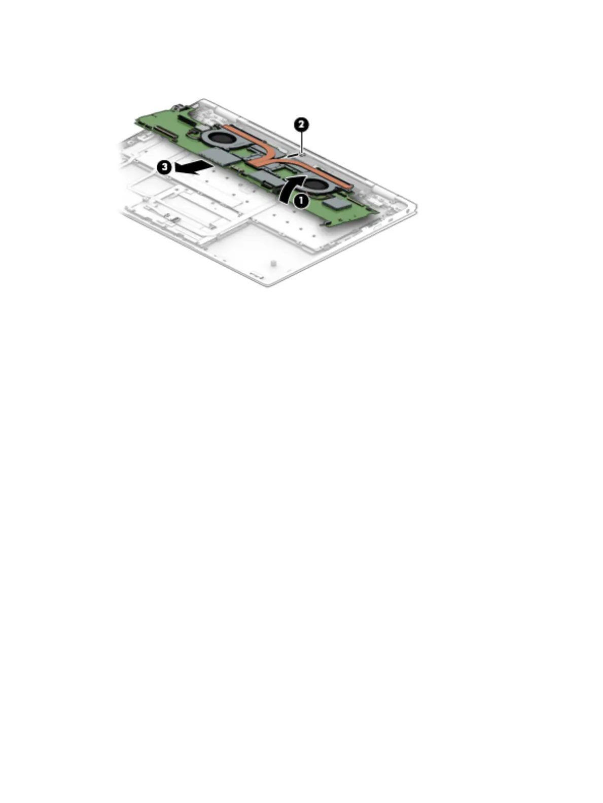 5. Pull the system board away from and out of the computer (3), making sure the connectors on the side of