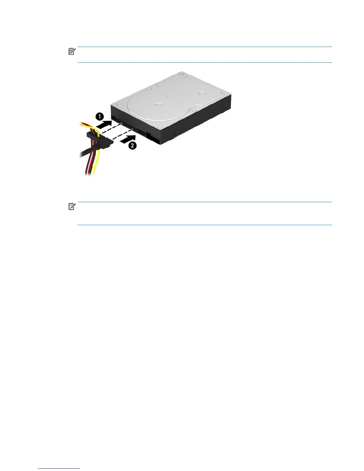 6. Connect the power cable (1) and data cable (2) to the back of the hard drive.