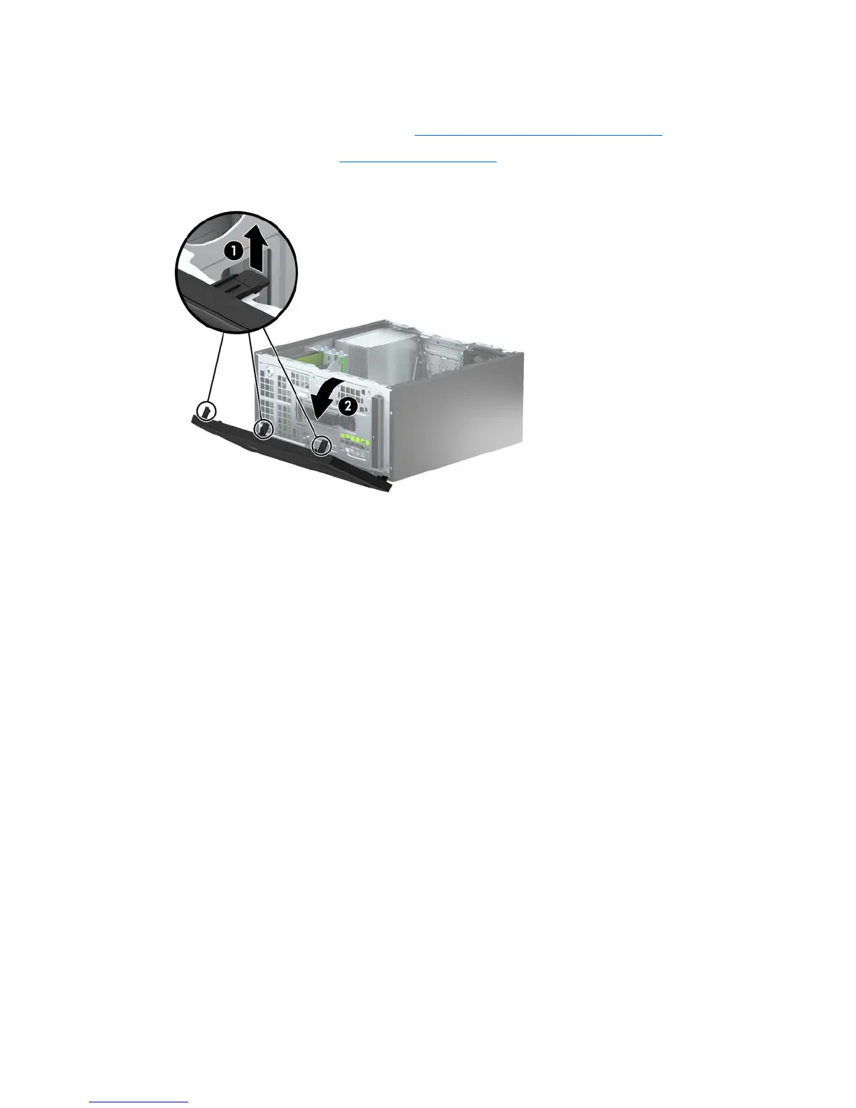 3. Lift up the three tabs on the side of the bezel (1), then rotate the bezel off the chassis (2).