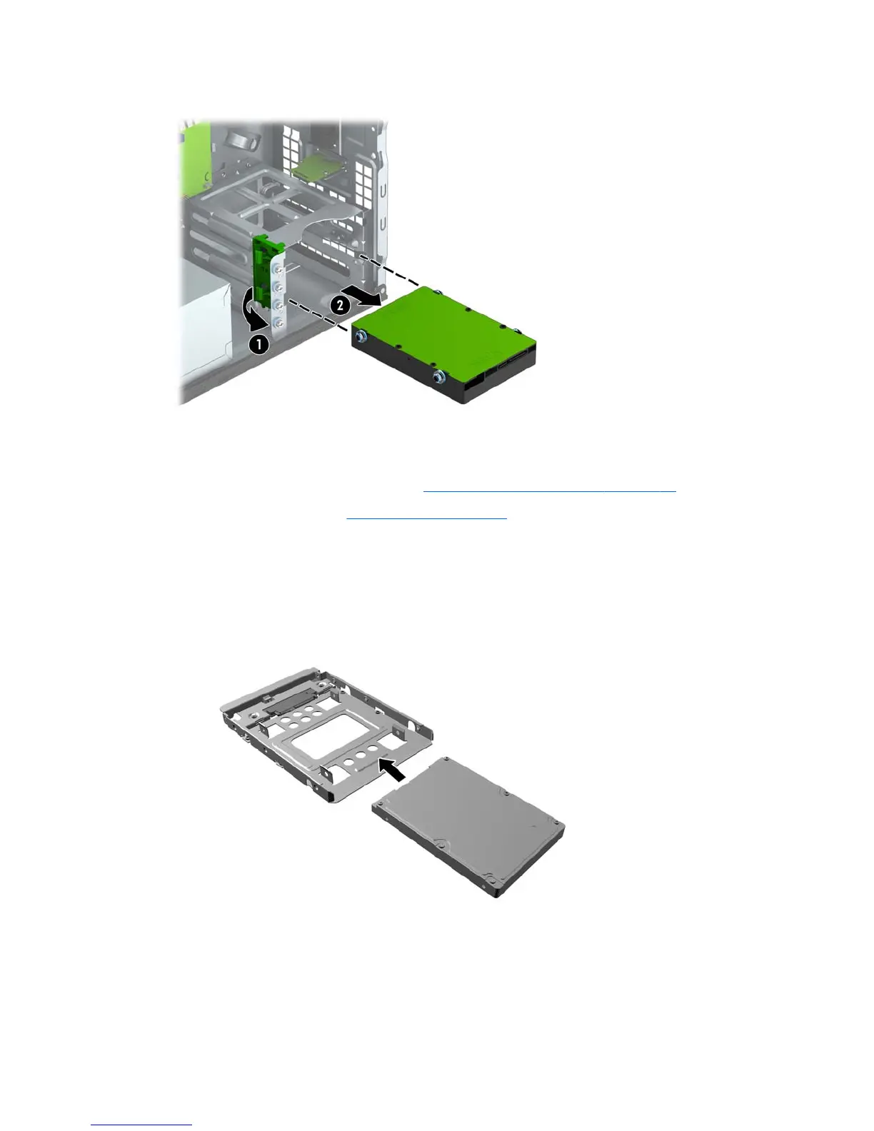 4. Pull the green latch next to the drive outward (1) and slide the drive out of the bay (2).