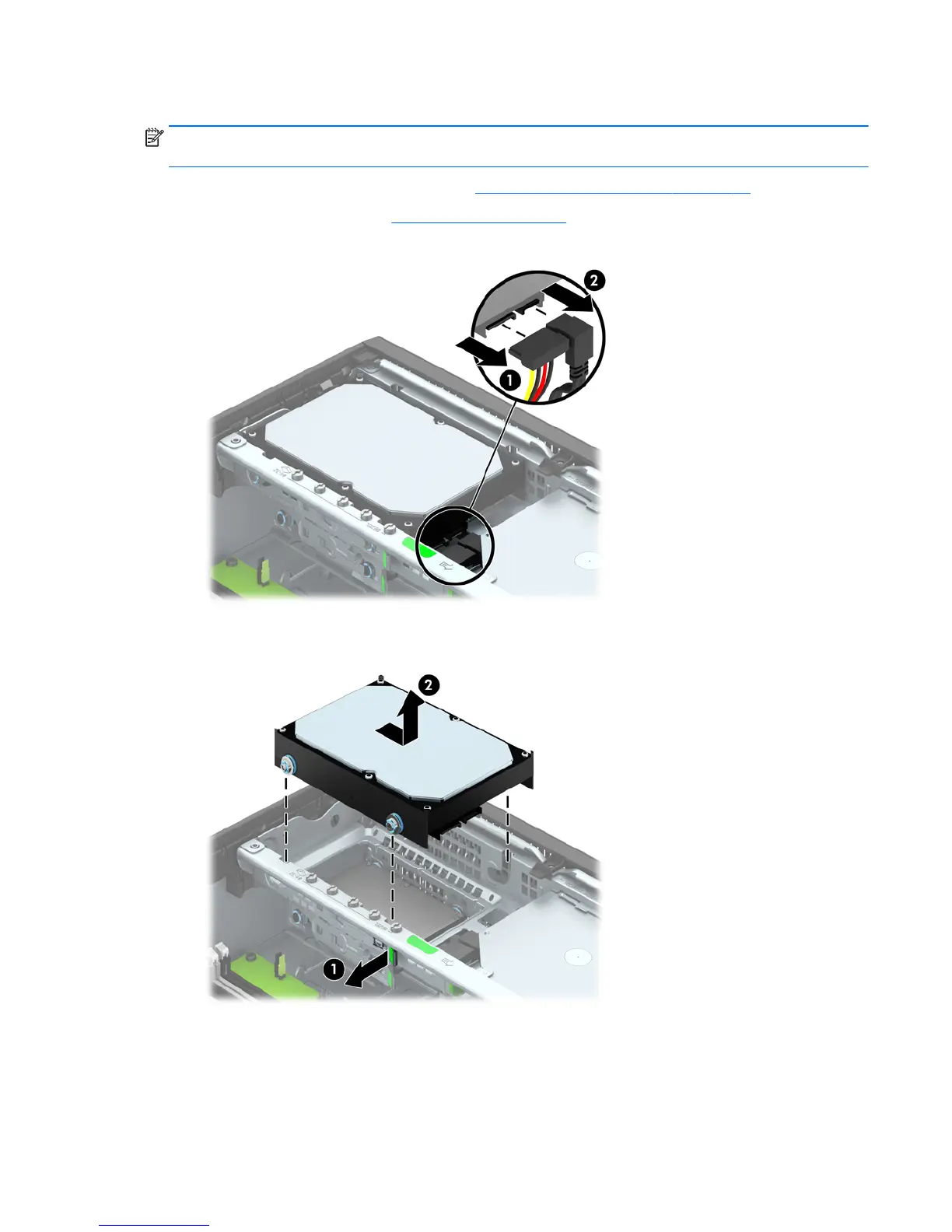 3. Disconnect the power cable (1) and data cable (2) from the back of the hard drive.