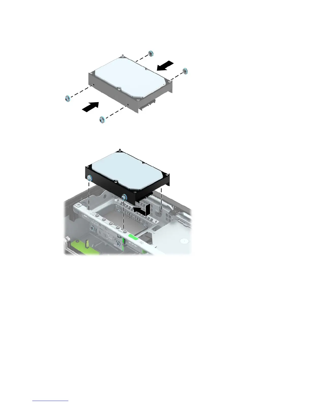 6. Align the guide screws with the slots on the chassis drive cage, press the hard drive down into