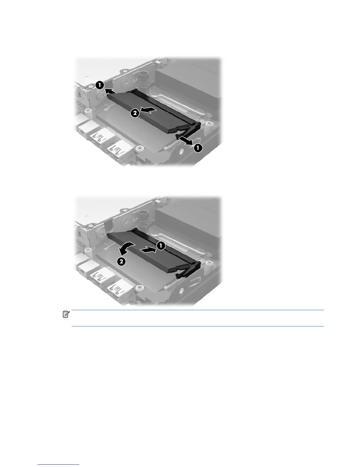 6. Slide the new SODIMM into the socket at approximately a 30° angle (1) then press the SODIMM down (2)