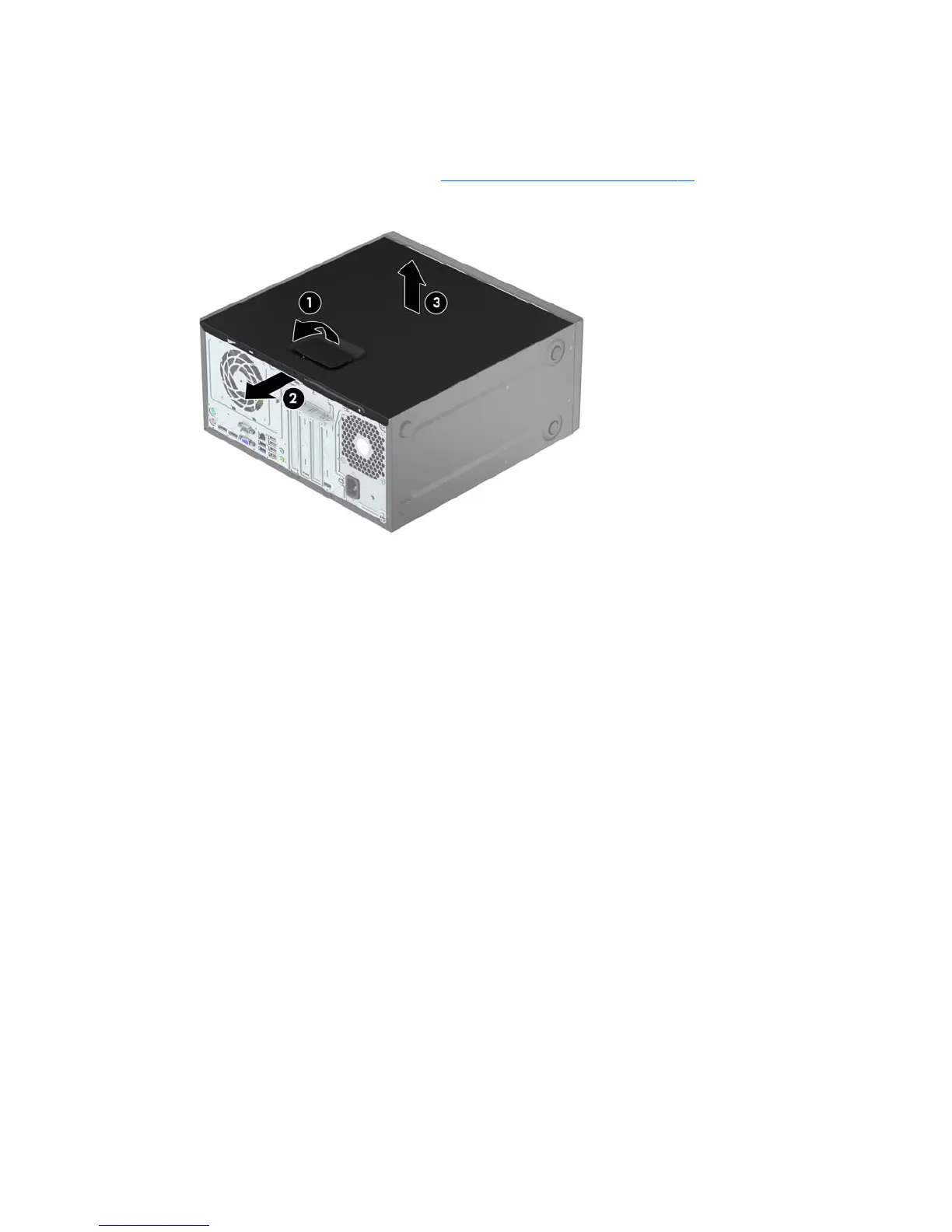 2. Pull up the access panel handle (1), and then slide the panel back (2) and lift it o the computer (3).