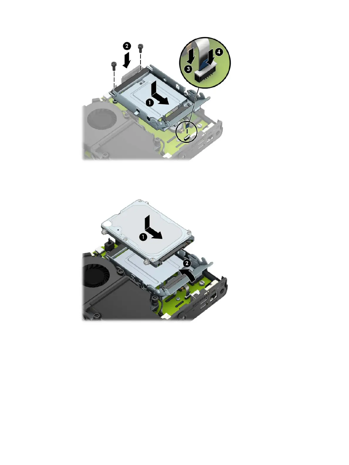 down into the cage, and slide it forward (1). Then rotate the hard drive latch down (2) to engage the