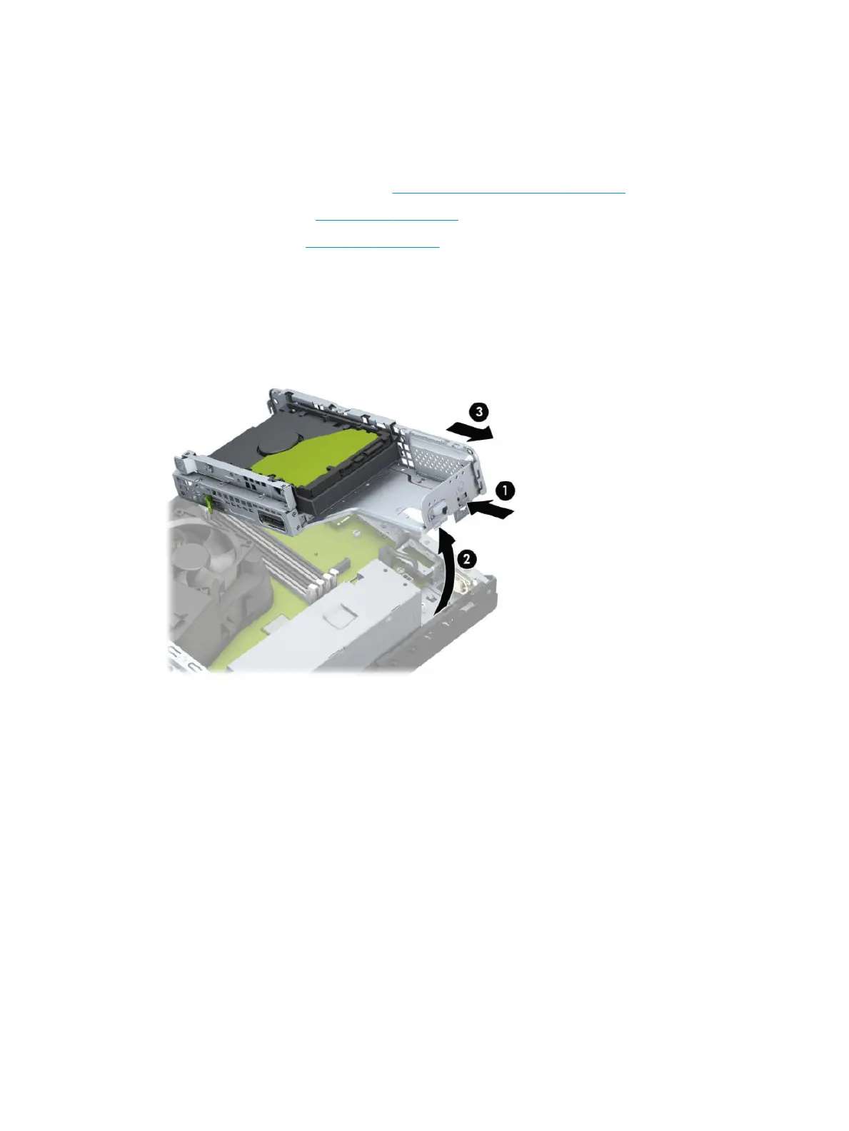 2. Press the release lever on the side of the drive cage (1), and then lift that side of the drive cage up (2).
