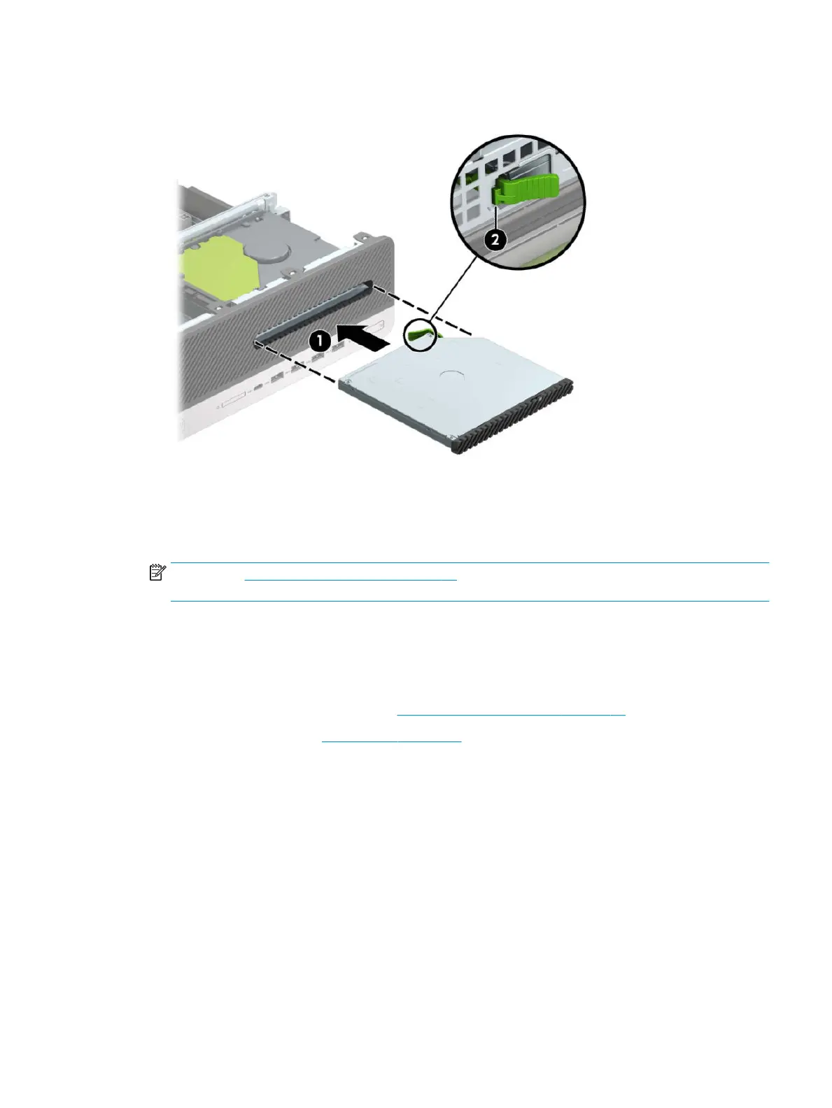 3. Slide the optical drive through the front bezel all the way into the bay (1) so that the latch on the rear of
