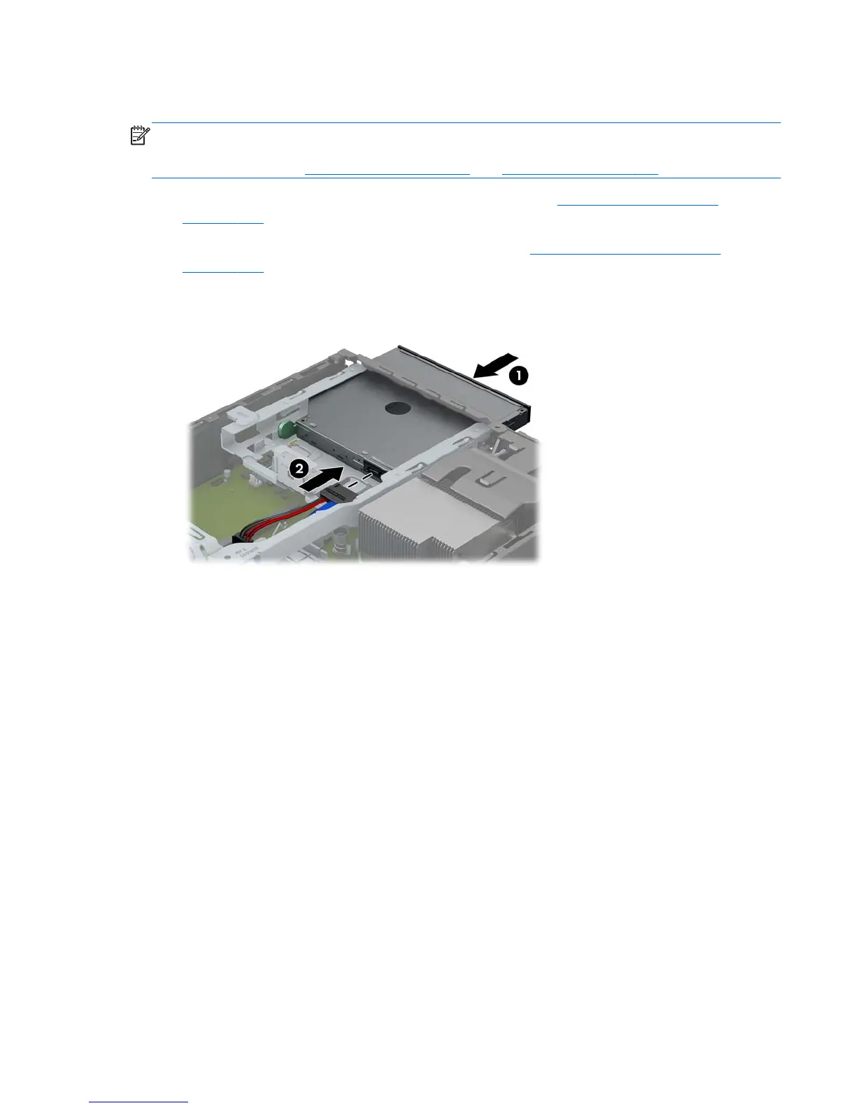 3. Slide the optical drive through the front bezel all the way into the bay so that it locks in place (1),