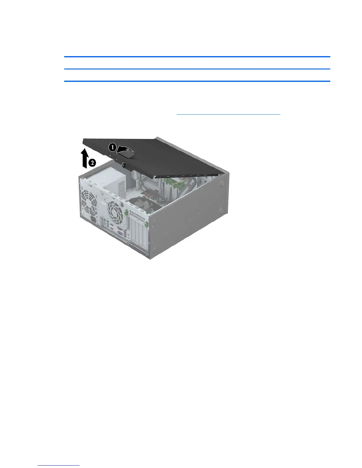 2. Lift up on the access panel handle (1) then lift the access panel off the computer (2).