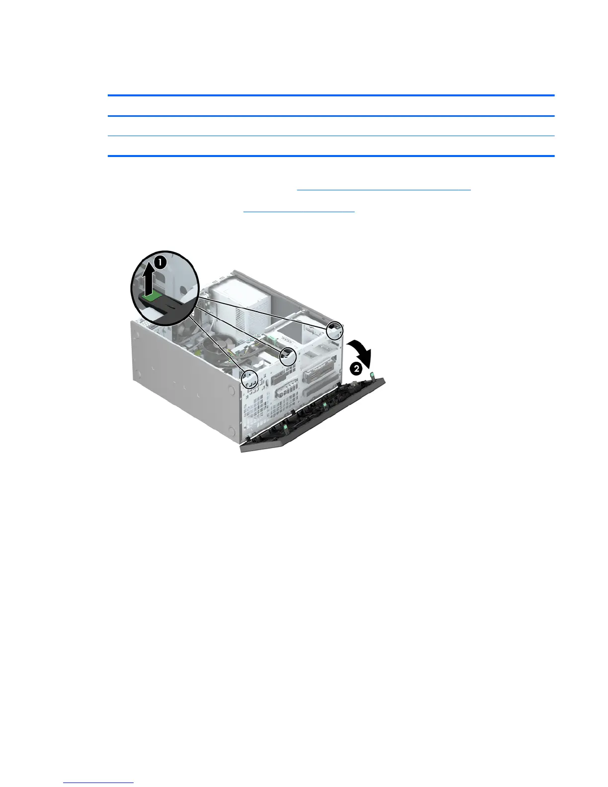 3. Lift up the three tabs on the side of the bezel (1), then rotate the bezel off the chassis (2).