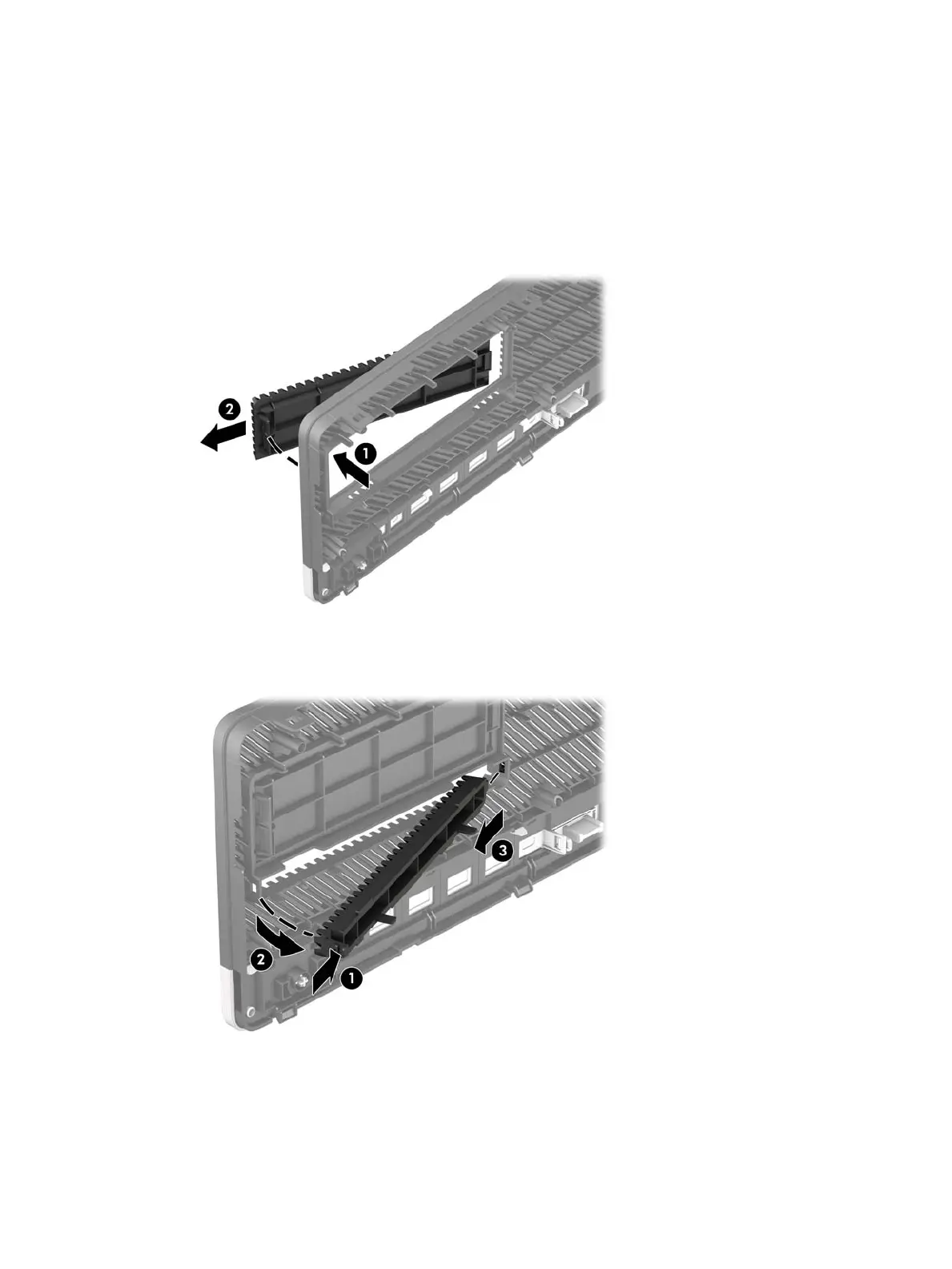 then rotate the blank away from the front bezel (2) and slide the left side of the blank out of the slot on