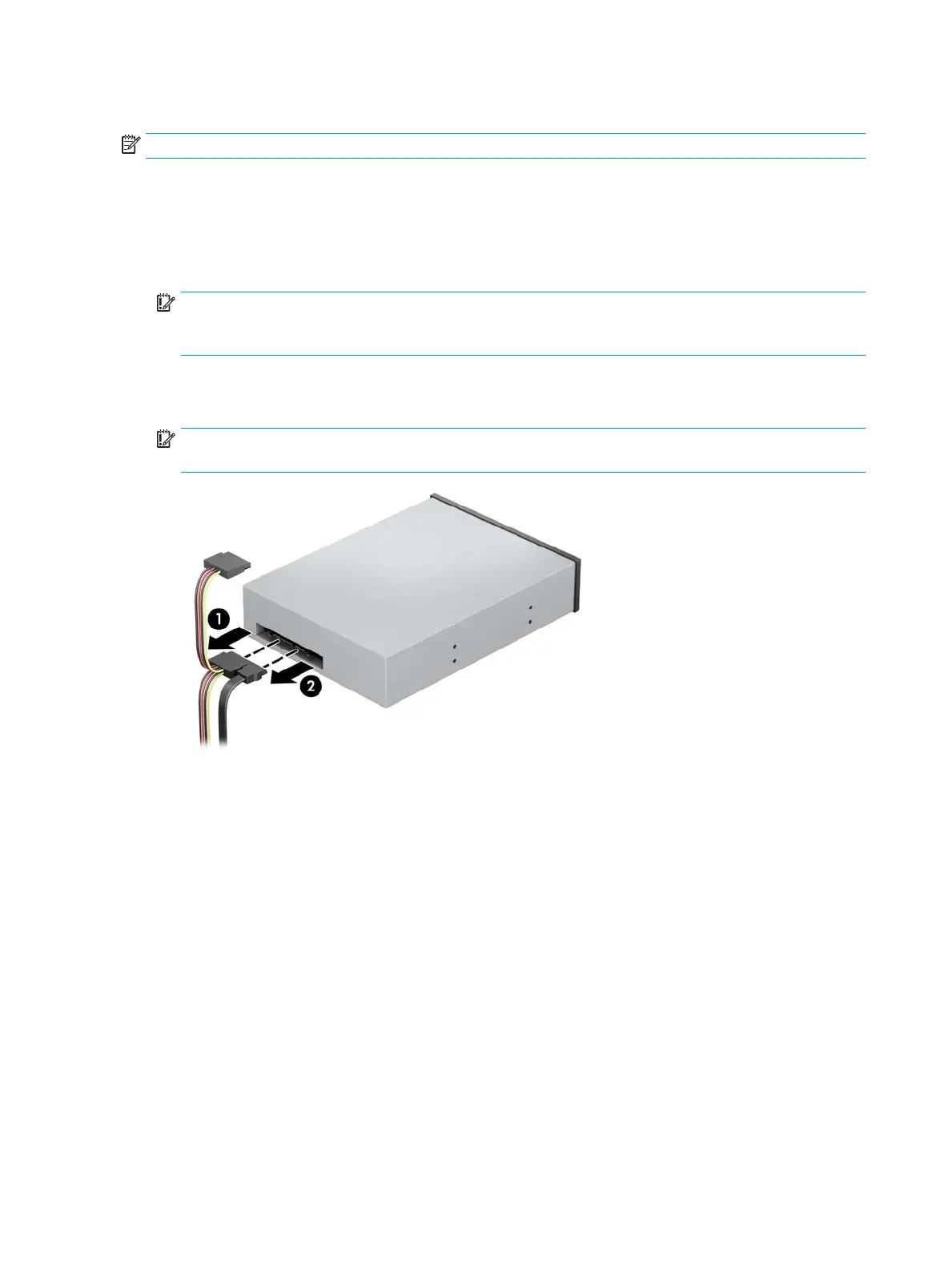 6. Disconnect the power cable (1) and data cable (2) from the rear of the drive.