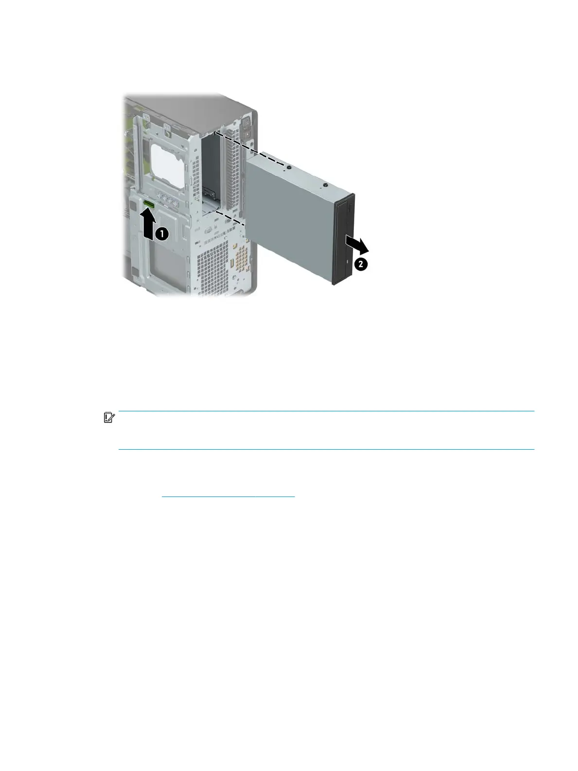 7. Push the green drivelock mechanism towards the optical drive (1), and then slide the drive from the
