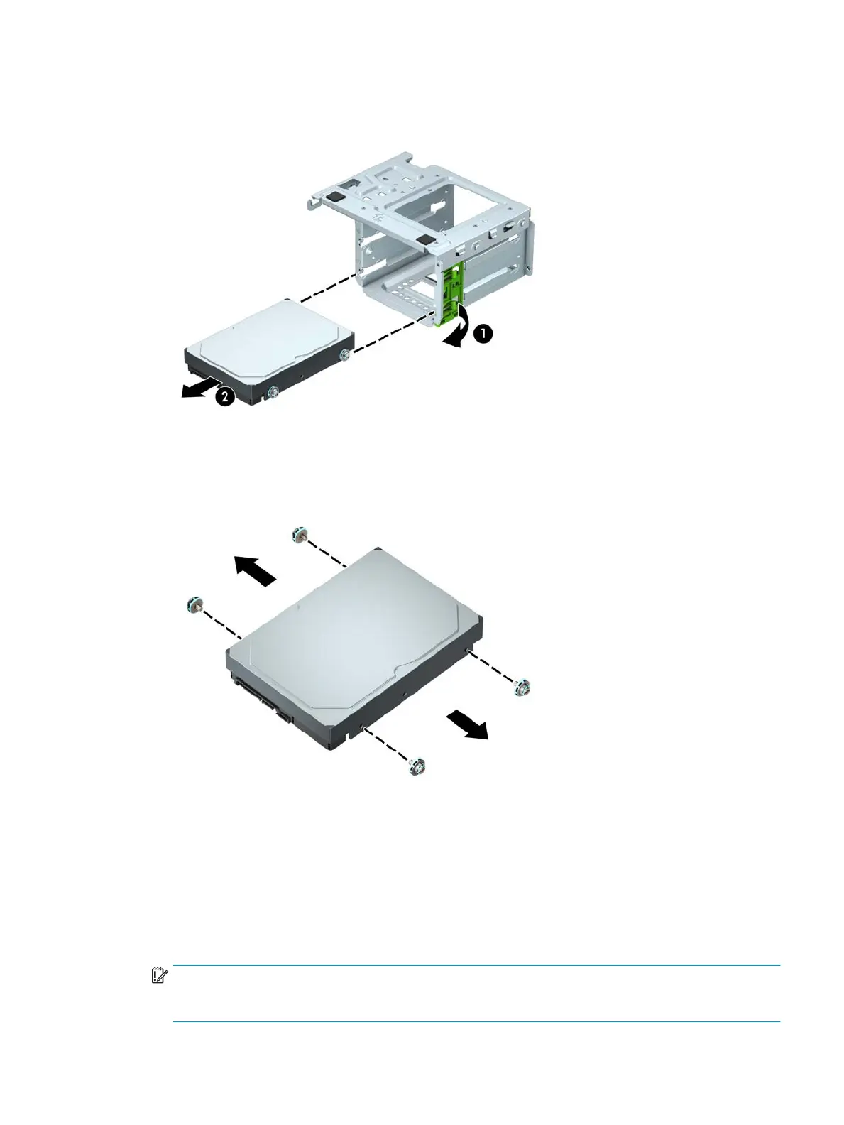 8. Remove the drive by pulling the release tab away from the drive (1) and sliding the drive out of the bay