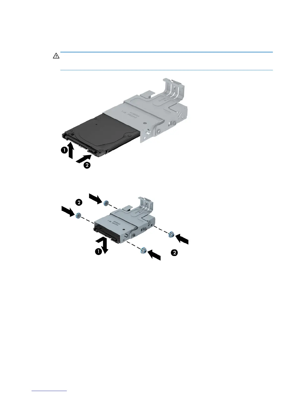 12. Position the hard drive so that the top of the hard drive is up against the top of the carrier (1) so