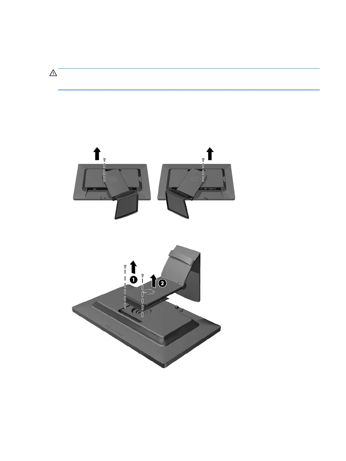 4. Remove the two upper mounting screws (1) then lift the stand off the monitor (2).